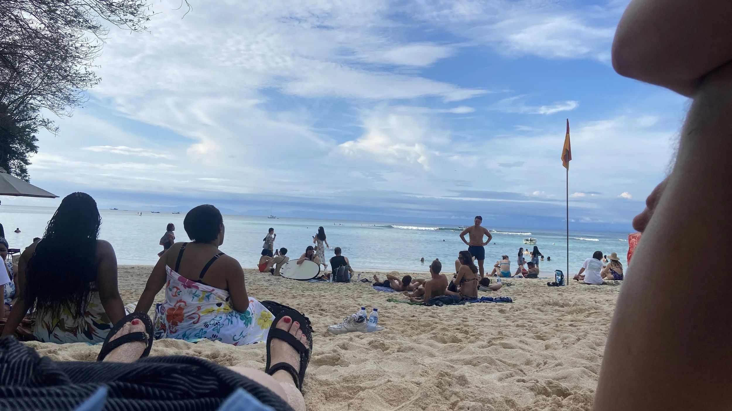 Leider geht es mir weiterhin nicht nur ziemlich, sondern richtig schlecht. Am ersten vollen Tag auf Bali versuche ich noch mit Johannes die Gegend ein klein wenig zu erkunden. Sprich, ich gehe mit frühstücken und versuche der Kellnerin mit Händen und Füßen zu verdeutlichen, dass ich doch eigentlich nur ein Toast ohne alles und eine Flasche Wasser möchte. Später springe (oder eher gesagt; nehme ich langsam) hinter Johannes auf dem Roller Platz und wir fahren zu zwei nahe gelegenen Stränden. Meine letzten Kräfte sind schnell aufgebraucht und ich lege mich einfach nur noch in den Sand und schaue mir alles aus der Horizontalen an.