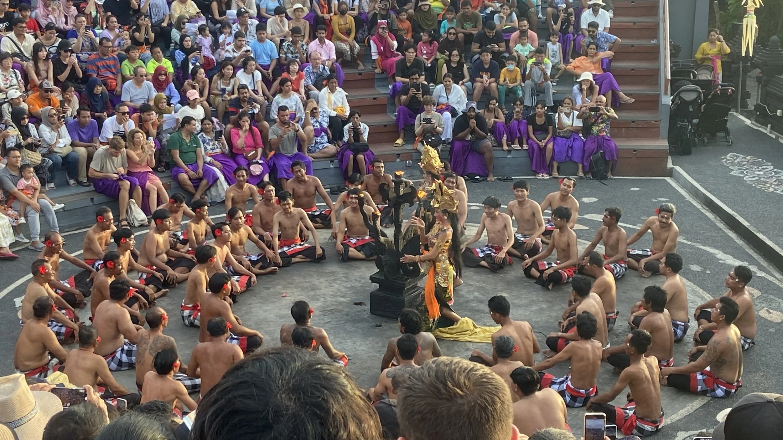 Als kleines Silvester-Spektakel schauen wir uns im Tempel von Uluwatu einen Kecak Dance an. Dieses balinesische Tanzdrama hat Tradition. Wir erleben, wie ca. 50 Männer mit einem schwarz-weiß karierten Lendenschutz bekleidet Verse vortragen, während uns die entsprechende Sage dazu vorgeführt wird. Dazu gibt es einen richtig epischen Sonnenuntergang und es fühlt sich gar nicht so an, dass wir Indonesien den Tag darauf verlassen werden.