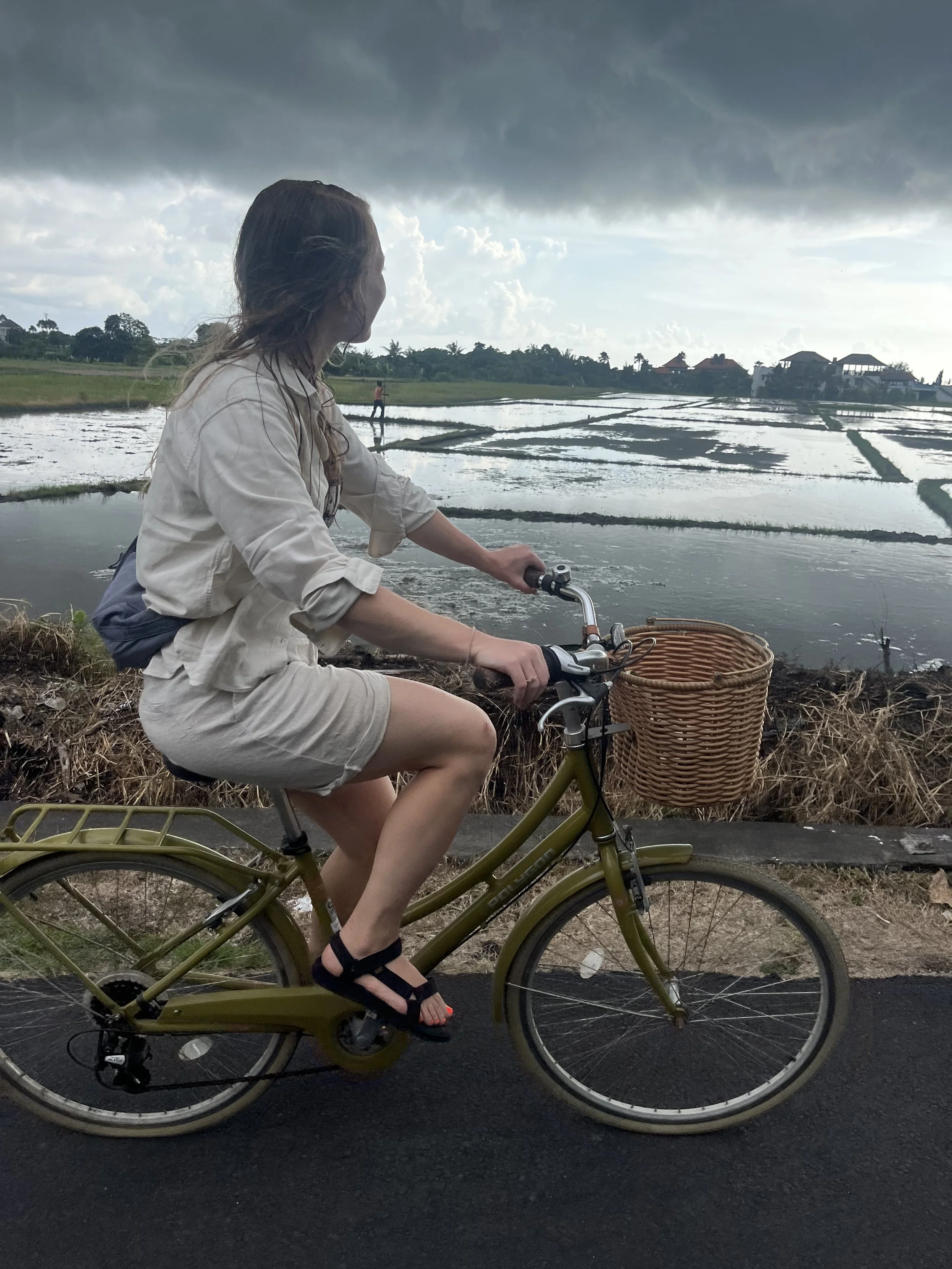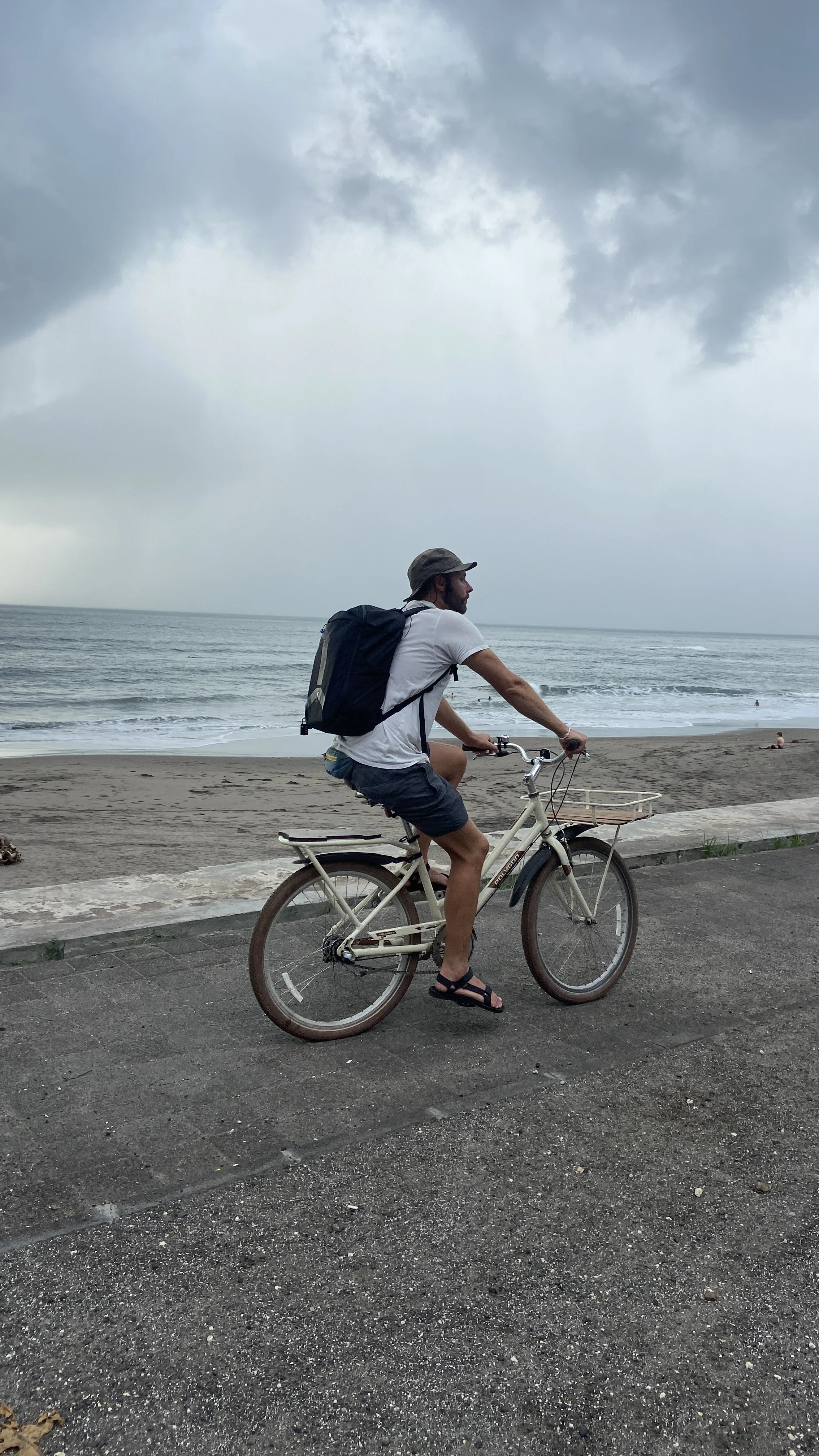 Wir genießen das Fahrradfahren an diesem Ort sehr. Es ist so schön sich einfach auf den Drahtesel zu schwingen und mit eigener Muskelkraft zum Strand runter zu düsen. In der Regel zahlt man für das Parken am Strand einen kleinen Betrag, doch Fahrräder scheinen sogar frei zu sein. Der Parkplatzwächter freut sich immer, wenn wir an ihm vorbei radeln und fragt nach unseren Plänen. Obwohl auch einige Indonesier ein Fahrrad besitzen, scheinen wir mit unserer Erscheinung immer ein kleines Lächeln auf die Gesichter der Einheimischen zu zaubern, wenn wir ihnen in den Reisfeldern begegnen.