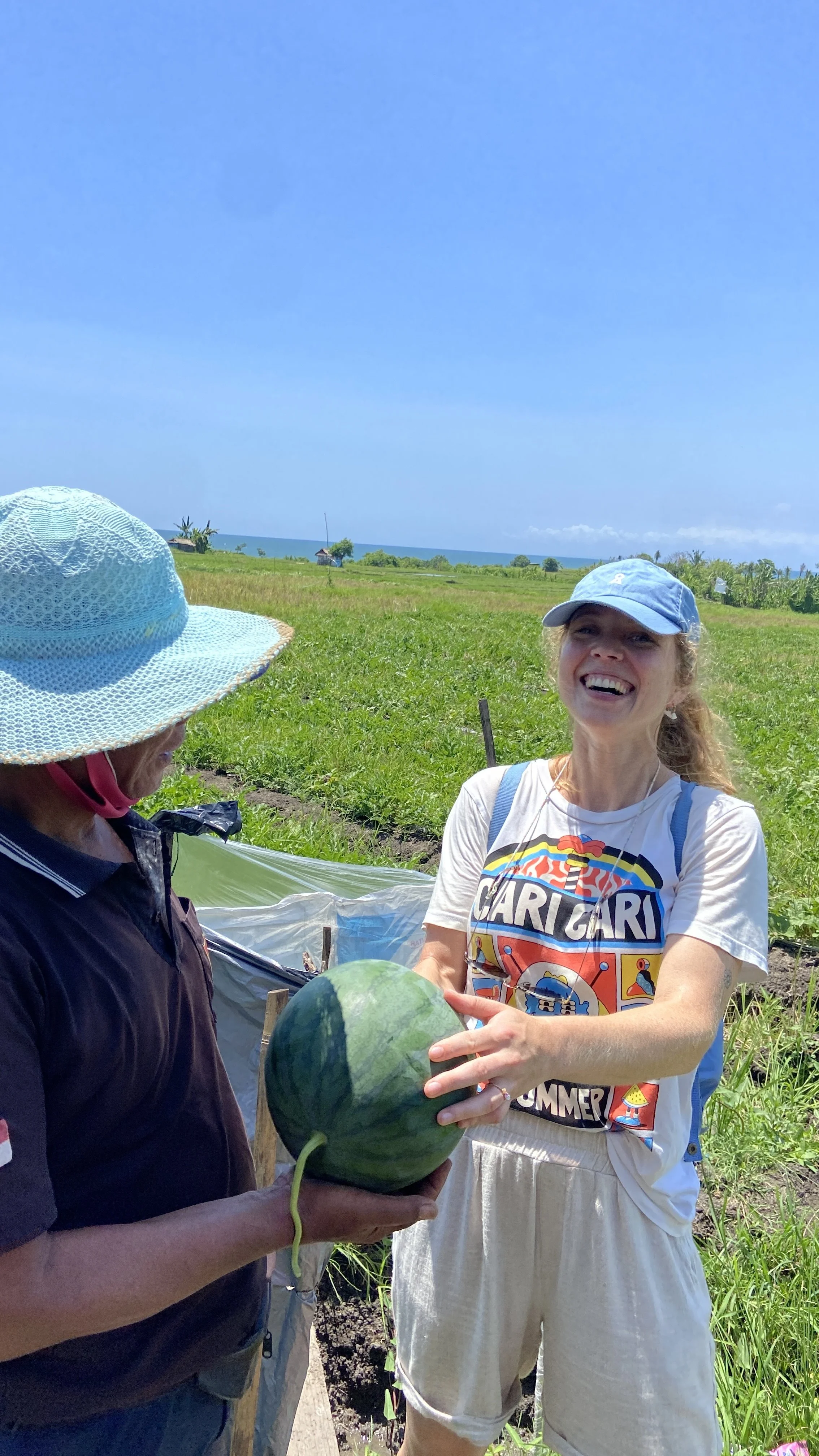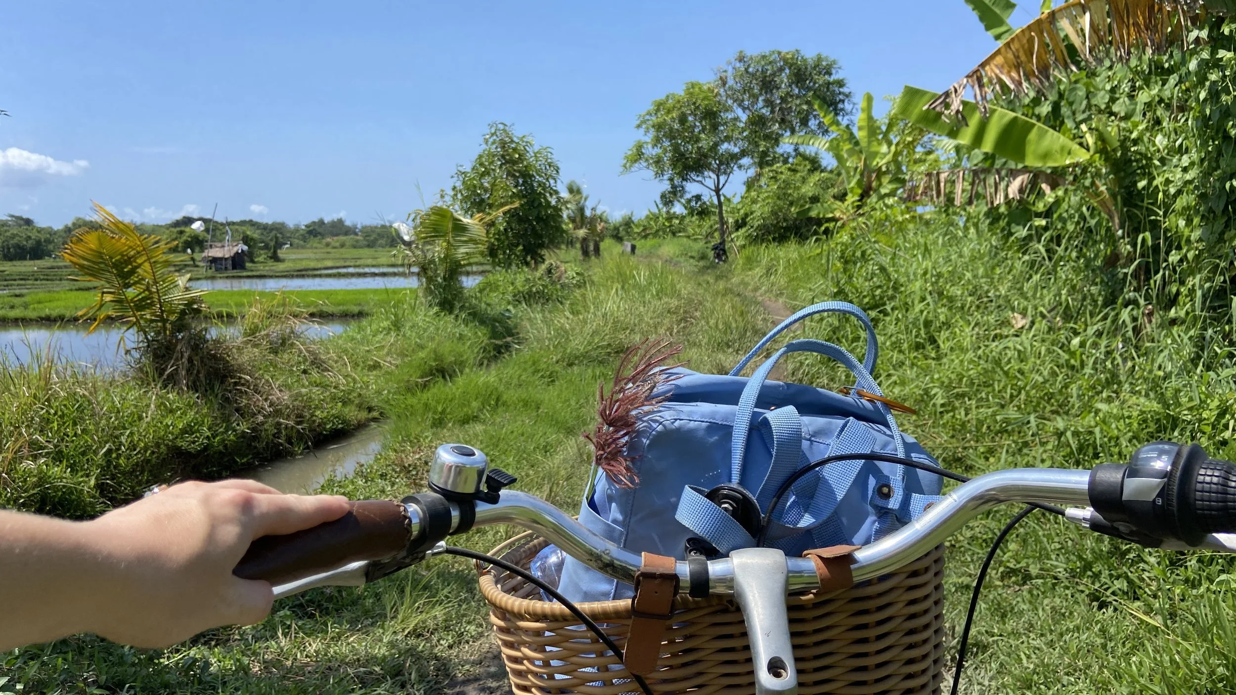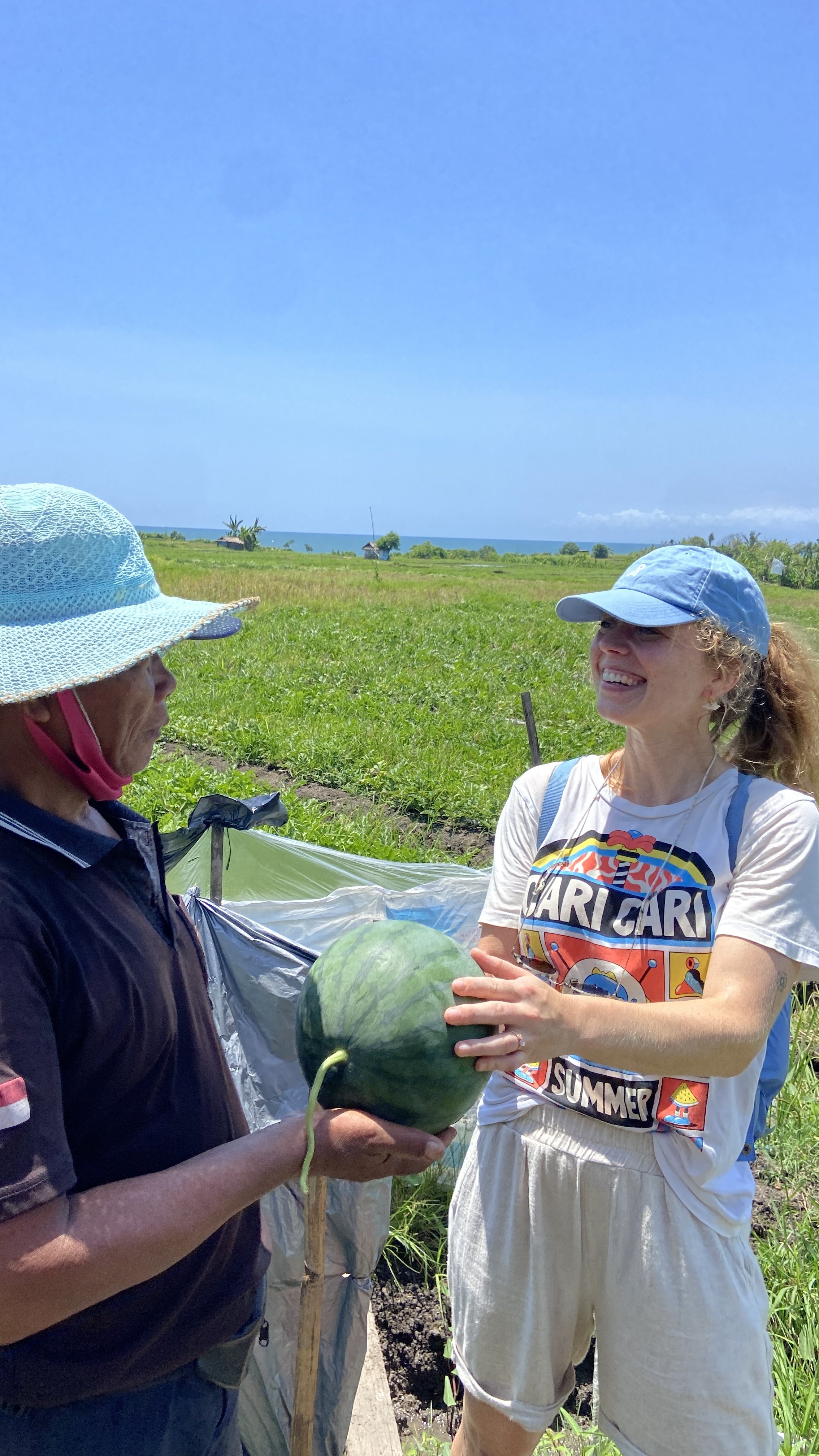 Apropos Einheimische: Ich mache noch eine richtig schöne Erfahrung als ich mit dem Fahrrad auf dem Rückweg von einem Tempel durch die matschigen Reisfeld-Wege schiebe. Just in dem Moment denke ich darüber nach, dass es selten touristische Sehenswürdigkeiten - wie der zuvor besichtige Tempel - sind, die für mich ein Land ausmachen und in besonderem Maße begeistern, sondern die Begegnungen mit den dort lebenden Menschen. Hier auf dem Weg steht ein indonesischer Farmer und versucht mit mir ins Gespräch zu kommen. Englisch kann er außer „Hello“ keines. Ein Hoch auf meine indonesische SIM Karte und Google Translate. Ich nutze die Gelegenheit einfach mal zu fragen, ob er Wassermelonen anbaut und ich in dem Falle eine von ihm kaufen könne. Er bedeutet mir, dass das möglich sei und düst mit seinem Roller vor, während ich mich mit dem Fahrrad hinter ihm her schlängel. Er scheint kurz einige Optionen abklopfen zu müssen, denn dann parken wir und ich laufe mit ihm in tiefer gelegene Feldabschnitte nach. Hier dösen gerade viele Menschen, die sonst sicherlich auf dem Feld arbeiten, im Schatten der Mittagssonne. Einen holt er heran und ich suche mir eine Wassermelone aus. Noch kurz gezahlt und bedankt und schwups landet die Wassermelone in meinem Fahrradkorb und ich radele ganz erfüllt davon. Diese Melone schmeckt dann später natürlich noch mal besonders gut 😊.