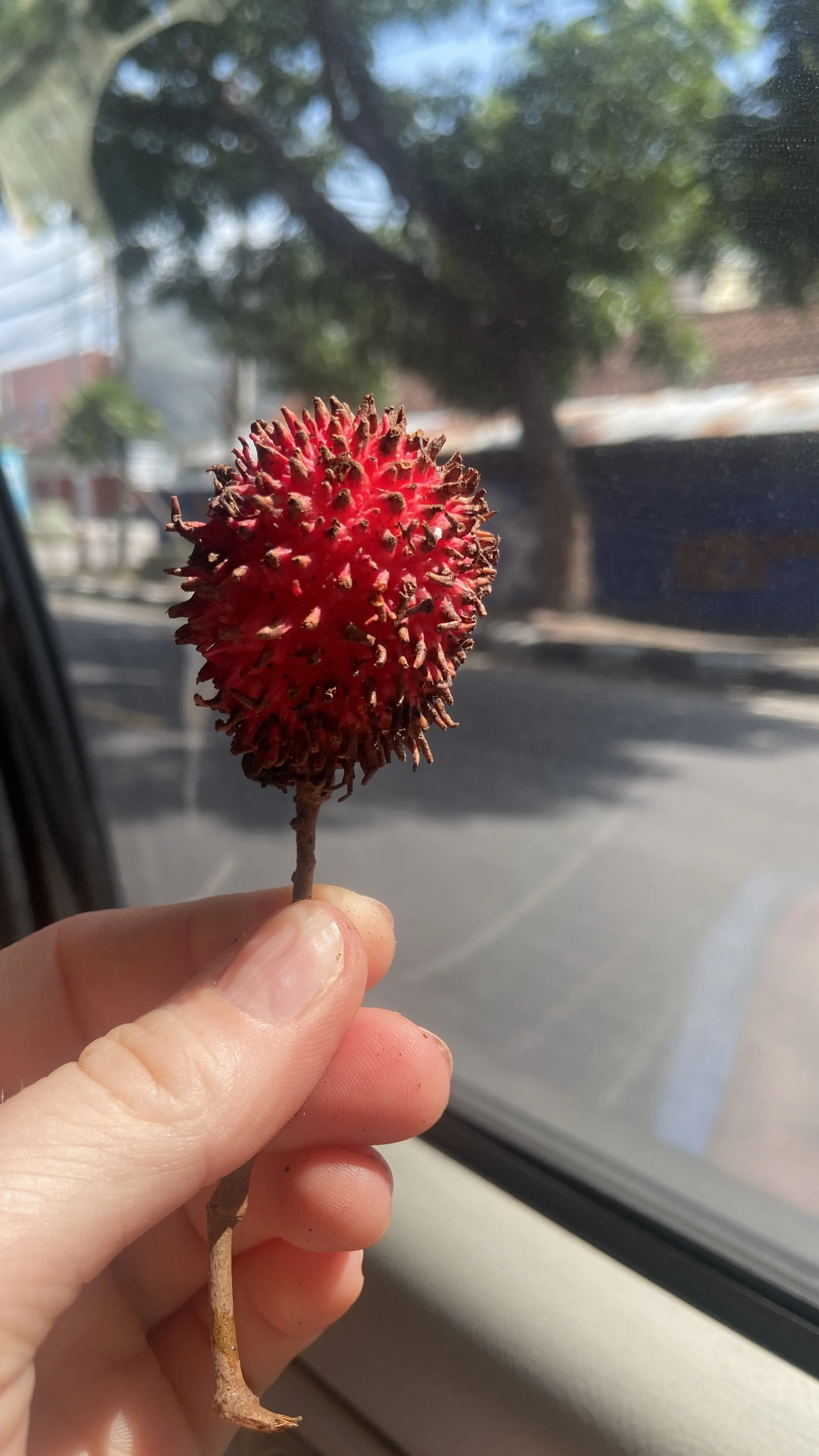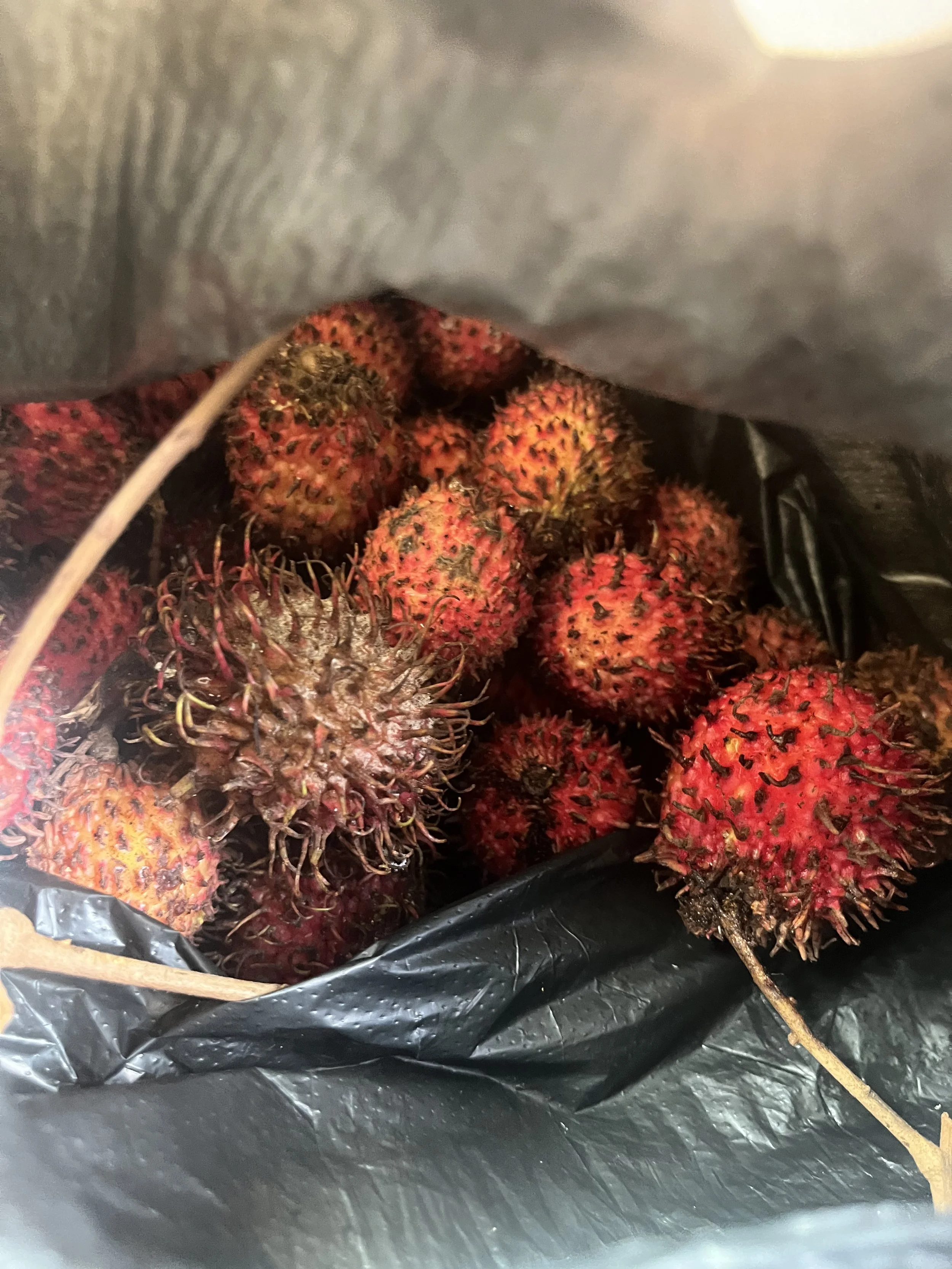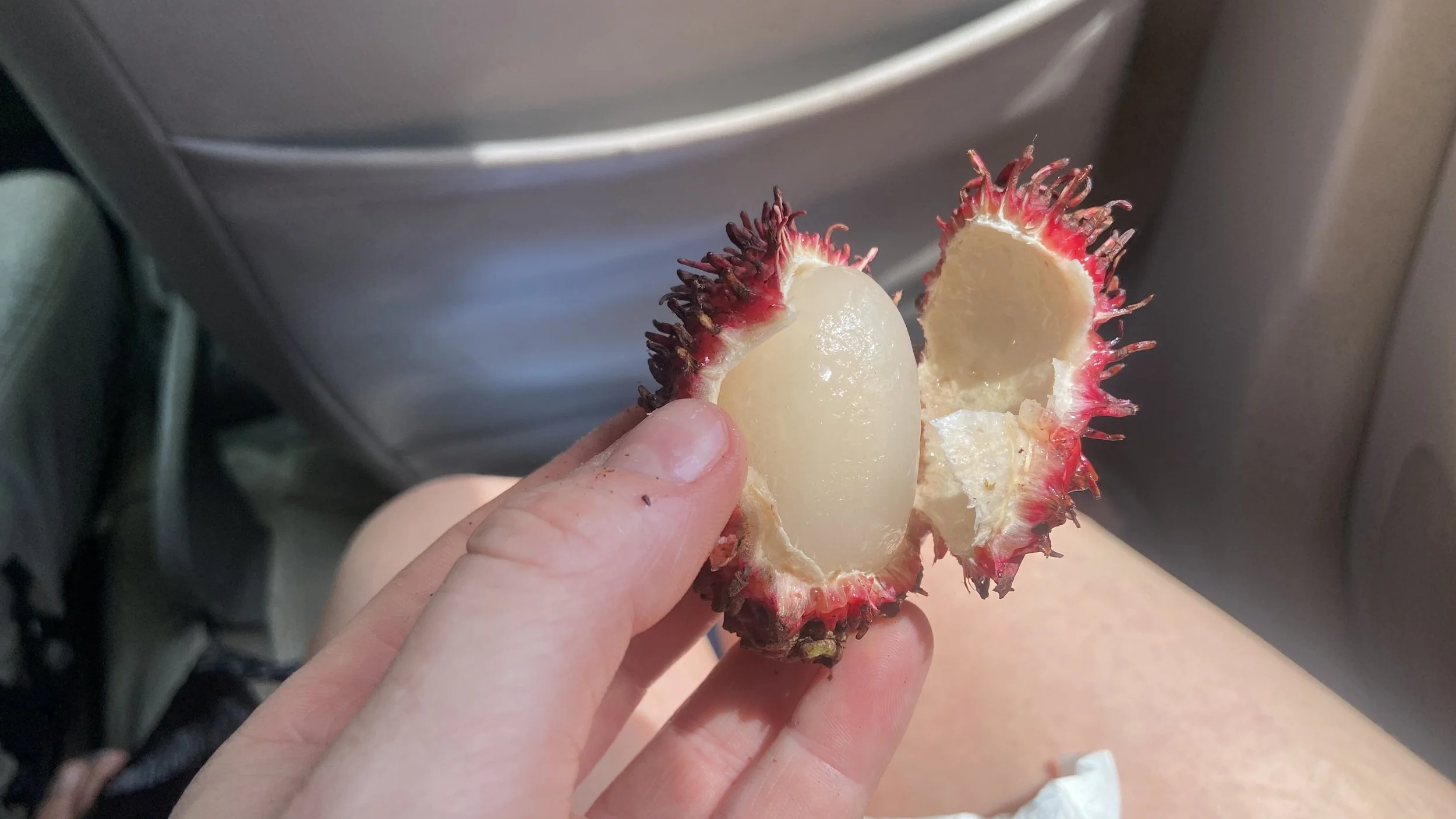 Er fragt uns, ob wir schon mal Rambutan probiert haben. Nein, haben wir nicht – das soll sich dann schnell ändern. Adanan hält kurzerhand an und kauft ein Kilo der Frucht für uns. Er zeigt uns auch wie wir diese rote Farbenpracht schälen müssen. Es schmeckt richtig gut, ich finde ein wenig vergleichbar wie Litschi. Vollkommen klar, dass hier jetzt ab sofort das „Team Rambutan“ im Auto sitzt.