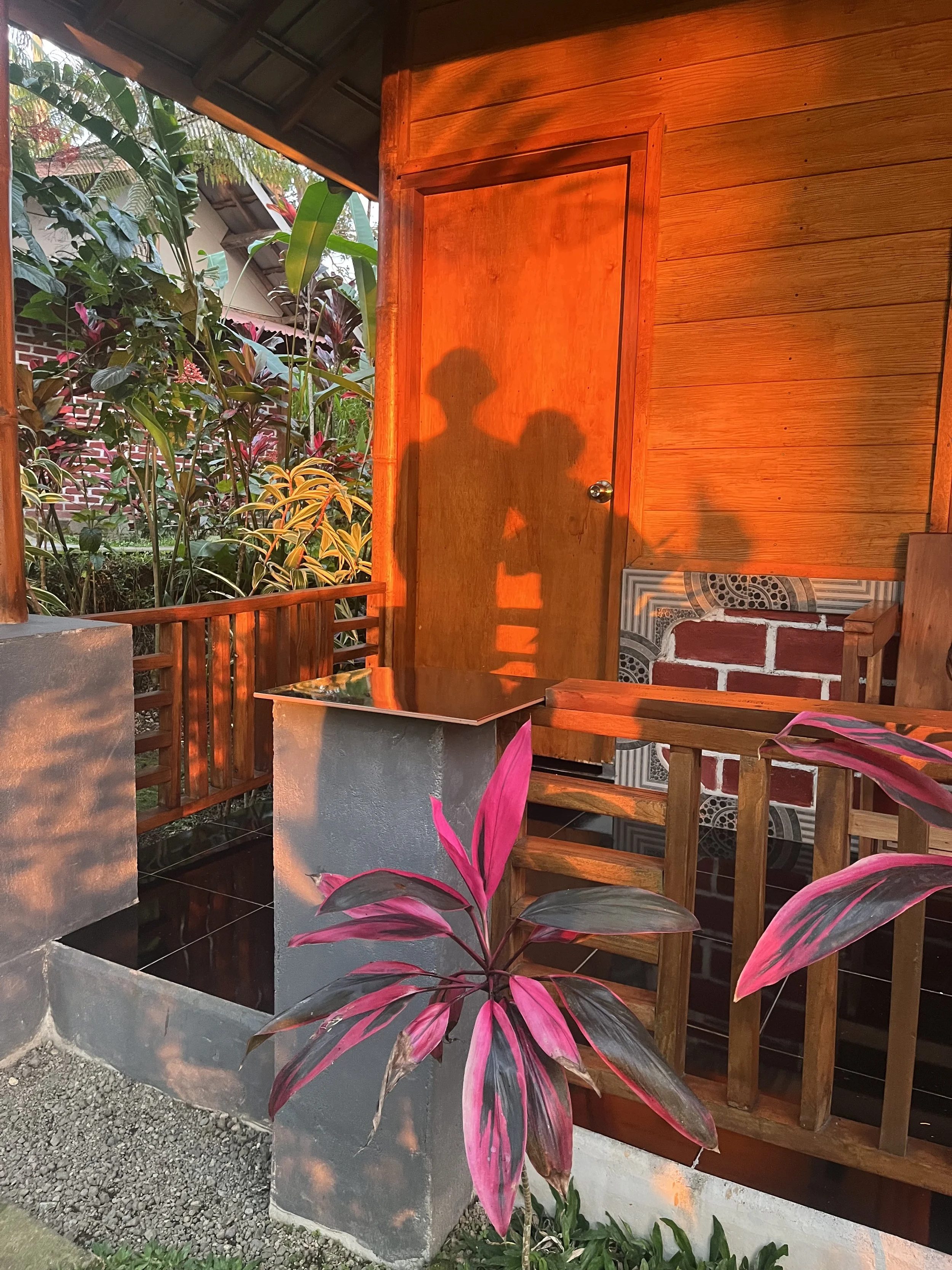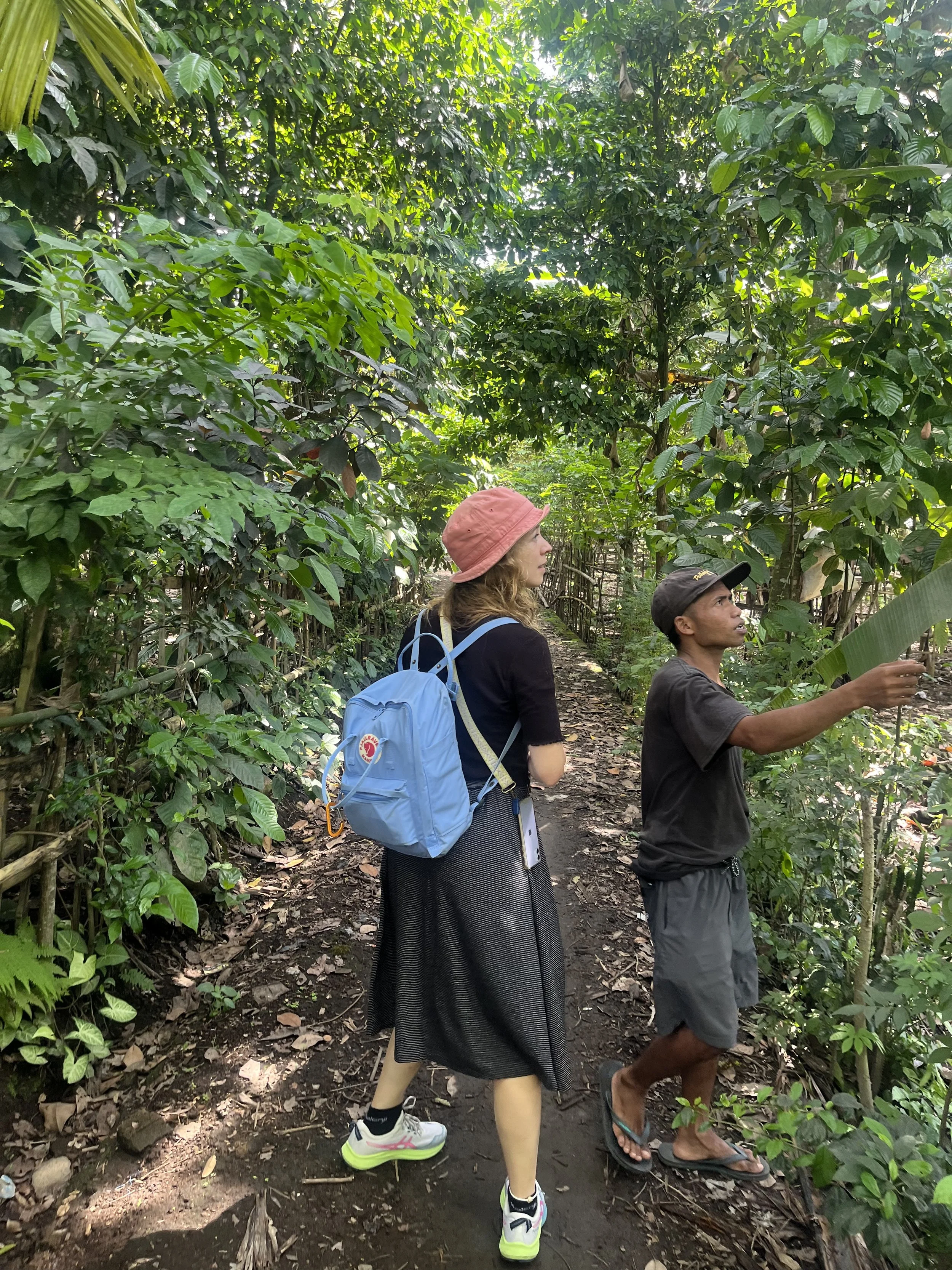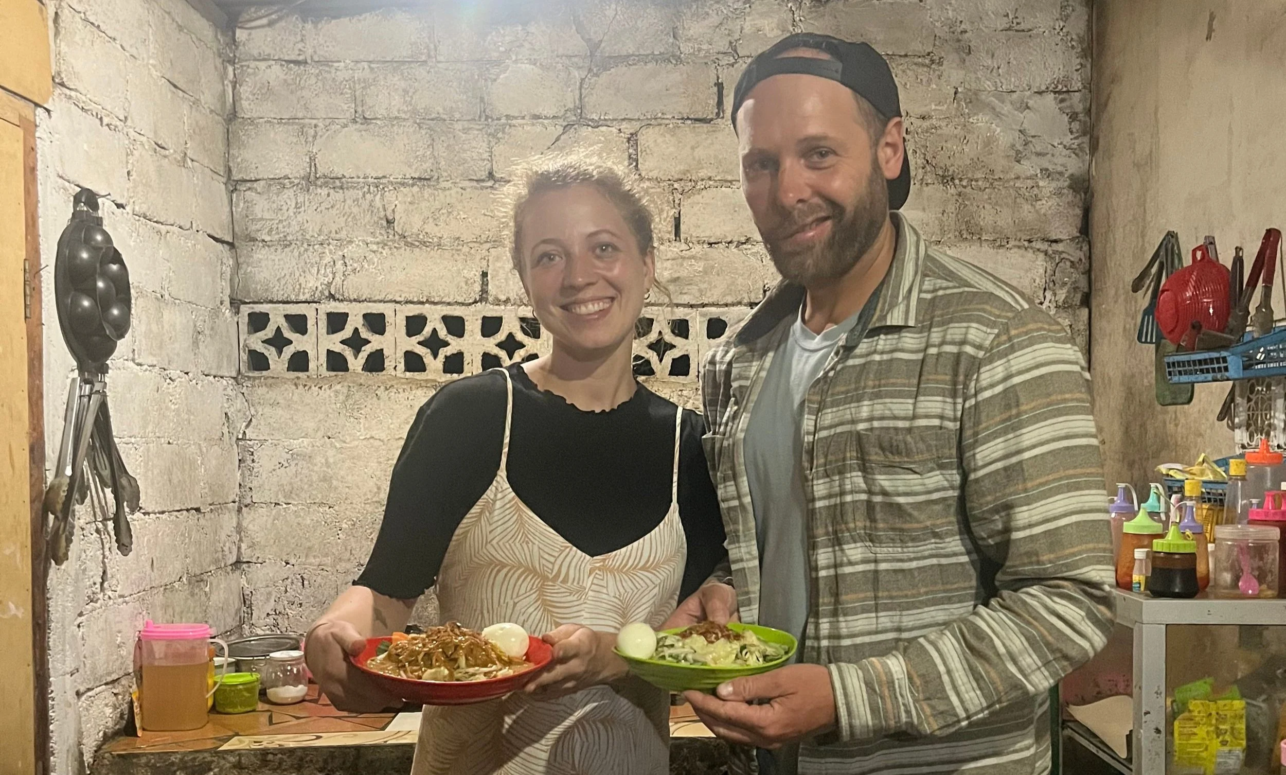 Wir nehmen uns erstmal Zeit in Ruhe anzukommen und genießen die bisher größte Gastfreundschaft auf der gesamten Reise. Während wir vor unserer Hütte sitzen und in den Dschungel blicken, werden wir mit leckerstem Ingwertee versorgt. Dieser wird noch mit etwas Schwarztee gemischt. Außerdem betreibt unsere Gastgeberfamilie die Straße herunter einen eigenen Warung (i.d.R. ein [kleines] Familienbusiness; in dem Fall ein Restaurant; kann aber auch ein kleiner Shop sein) in dem es köstliche Gerichte gibt. Johannes hat es z.B. das Jackfruit-Curry besonders angetan. Mir schmeckt der Gado-Gado Salat, den wir am zweiten Abend bei einem kleinen Kochkurs unter Anleitung von Roons Tochter zubereiten richtig gut! Im Rahmen des Kochkurses ist es auch toll, dass wir Einblick in die Küche bekommen dürfen. Auf kleinstem Raum werden hier so viele leckere Speisen zubereitet. Eigentlich geht doch alles irgendwie.
