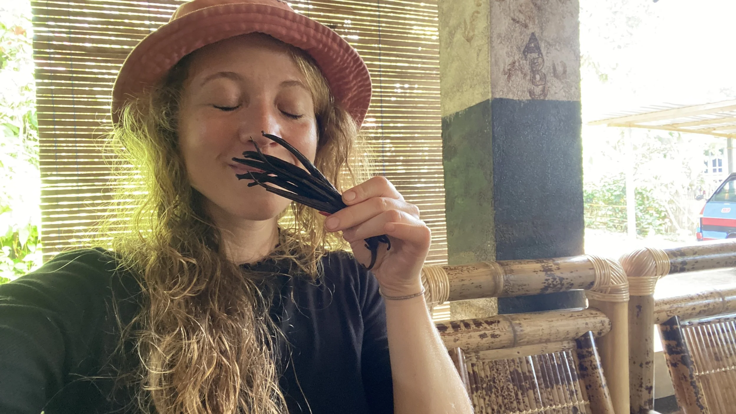 Ein Kaffee-Zwischenstop führt uns zu Roons und Astros Schwester. Diese vertreibt im Rahmen einer Kooperation der Dorfeinwohner Gewürze und Co. Mhhh frische Vanille-Schoten, Kakao-Bohnen (bei uns auch als Super-Food Kakao-Nibs im Supermarkt angeboten) und die interessanteste Entdeckung ist Tee aus der getrockneten Schale der Muskatnuss. Dieser soll bei allerlei Magenproblemen helfen. Und der Tee schmeckt auch, wenn man gerade nicht von diesen geplagt wird, richtig lecker. Vielleicht werde ich doch noch in Teilen zu einer Teetrinkerin. 😉