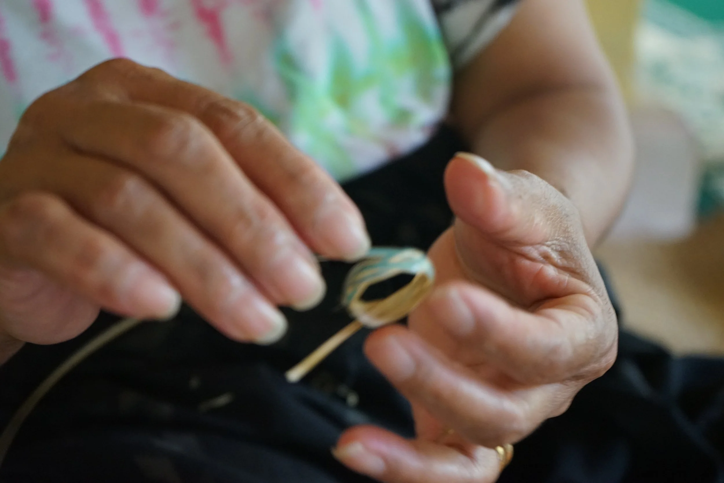 Nachdem ich mich stark zurück gehalten habe meinen Backpack mit irgendwelchem Bastelkram zu füllen, freue ich mich riesig, dass wir uns in Tetebatu nah am Bamboo Village befinden. Da möchte ich so gerne hin! Als wir dort ankommen werden wir direkt bei Miss Atun auf die Terrasse gebeten. Sie ist wohl die letzte Weberin, die das Handwerk des Bambuswebens von klein auf gelernt hat. Ihre Tochter ist nicht in ihre Fußstapfen getreten und so werden die Bamboo-Flechtereien wohl in geraumer Zeit nur noch maschinell durchgeführt werden. Ich finde es beeindruckend zu sehen mit welchem Geschick sie uns im Handumdrehen zwei Ringe hergestellt hat. Bei der Herstellung einer kleinen Box für die Ringe darf ich auch ein wenig mit flechten. Miss Atun ist so lebensfroh und richtig ansteckend mit ihrer guten Laune. Zwischendurch trudelt immer mal wieder jemand von ihrer Großfamilie ein. Nach unserem Eintreffen hat sie mich übrigens auch zuerst einmal „gestylt“, denn meine halboffenen Haare waren ihr wohl ein wenig zu wild. Also sitze ich während sie flechtet mit einem für mich gefühlt sehr strengen Dutt vor ihr, den sie mir im Handumdrehen auf den Kopf gezwirbelt hat. Zum Abschied steckt sie mir noch eine Blume zur Verschönerung hinein.