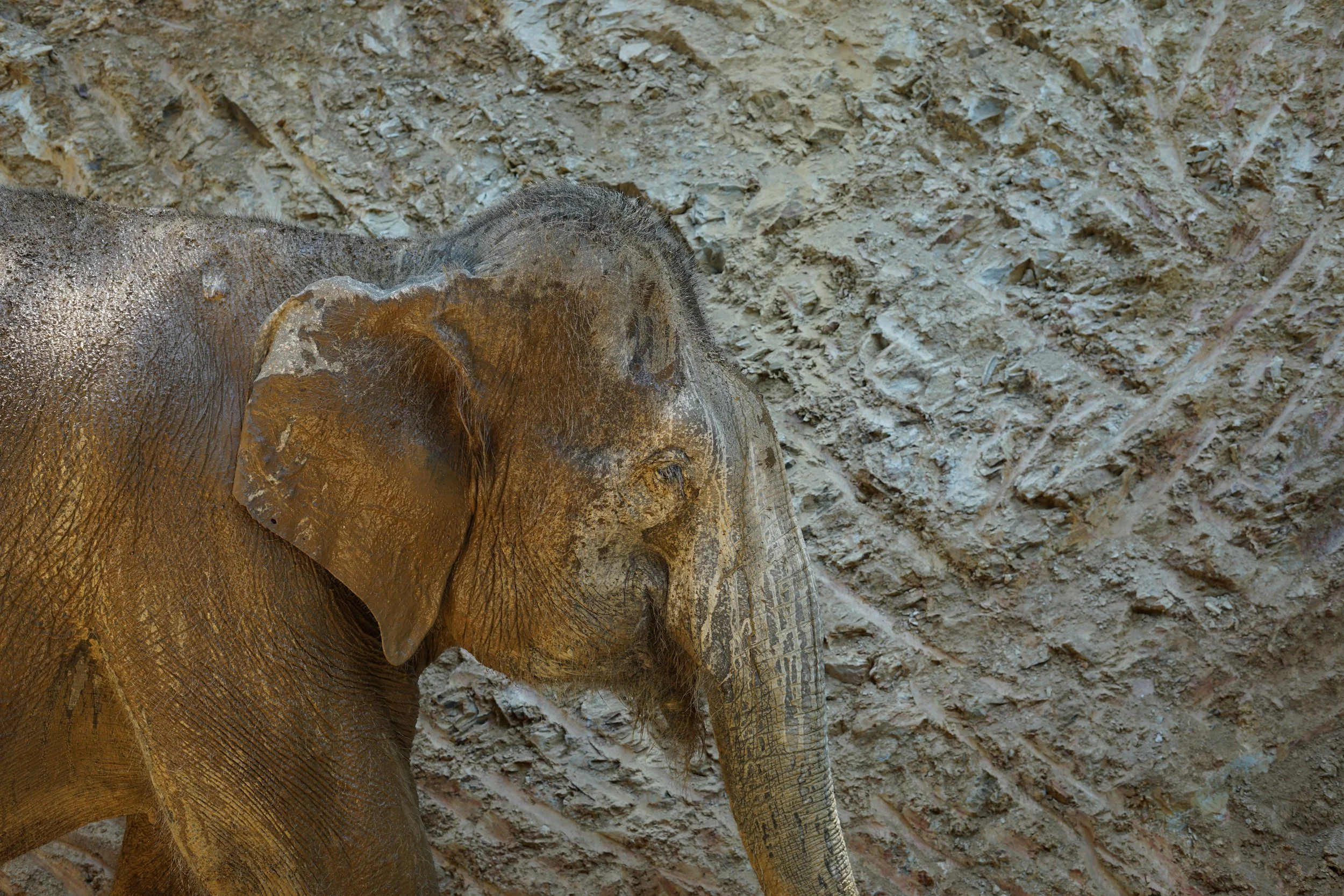 Elefant “Watermelon” badet lieber im Schlamm als im Teich.