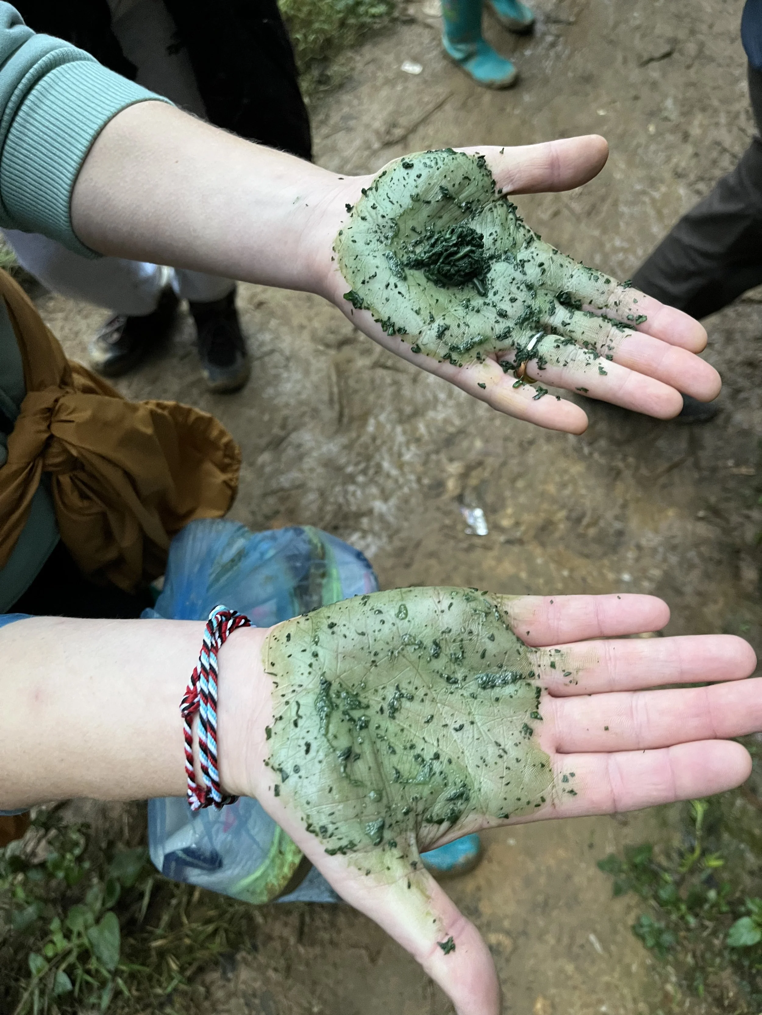An einer Stelle zeigt und Dinh auch die Indigo-Pflanze mit welcher Kleidung tief blau gefärbt wird. Wir dürfen die Farbintensität dann anschließend, wenn wir kein Problem damit haben, die kommenden 3 Tage blaue Hände zu haben, auch ausprobieren. Da bin ich natürlich direkt mit dabei und habe nach fünfminütigem Zerreiben der Pflanzenblätter in meinen Händen ein beeindruckendes Ergebnis.