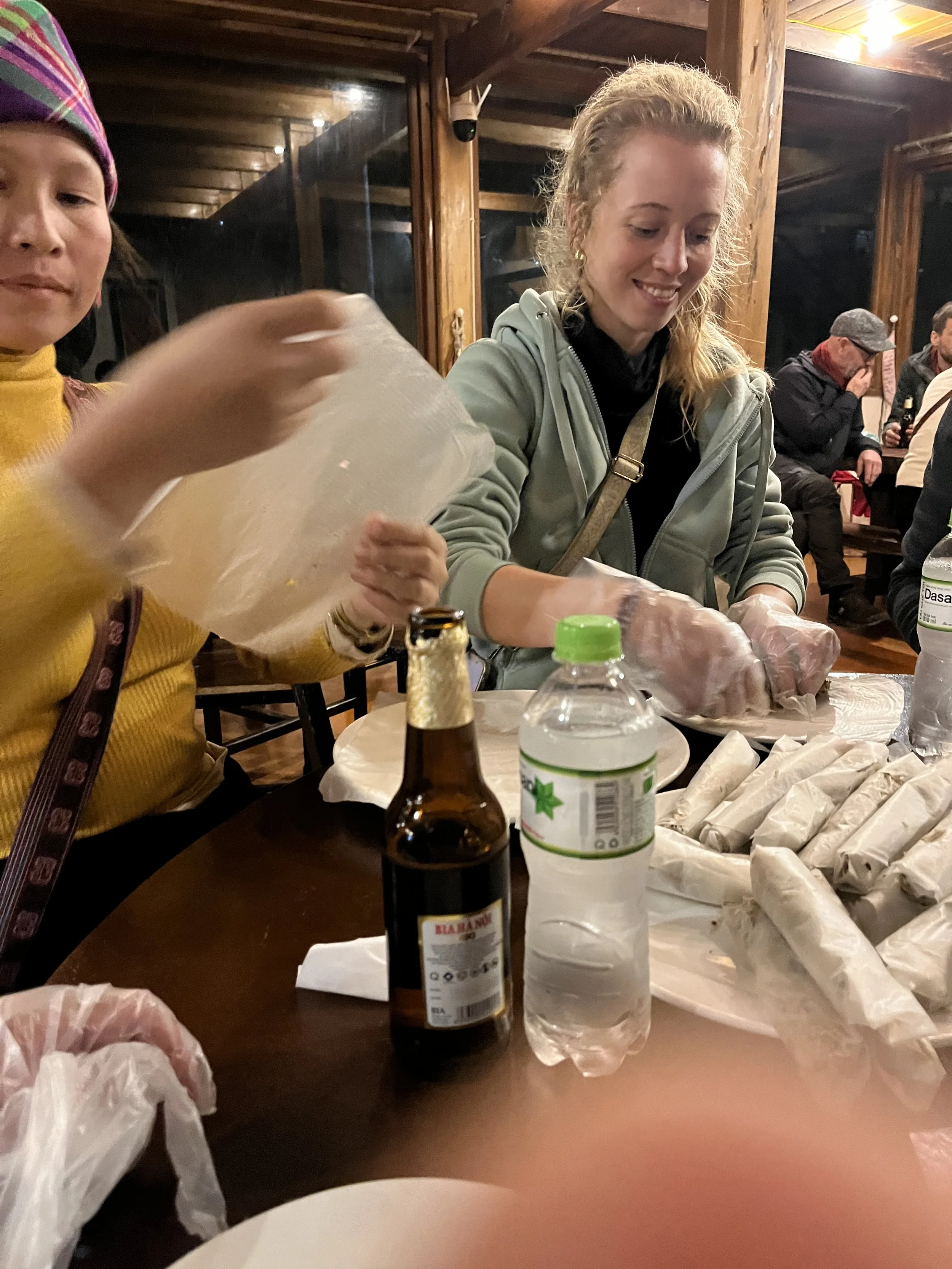 Mittlerweile ist es richtig eisig geworden, daher freuen wir uns aufs Essen. Die Frühlingsrollen dürfen wir dafür noch selber rollen, bevor wir dann unsere Zimmer beziehen. Dabei bestehen keine Zweifel, dass das eine ganz schön kalte Nacht wird (wir haben dann fast in allen Anziehsachen geschlafen, die wir dabei hatten) und zudem wohl auch nicht “bergidylisch ruhig”. Denn einige hundert Meter Luftlinie von unserem Home-Stay entfernt wird eine dreitägige Hochzeit gefeiert. Das Schönste daran sind die schiefen Karaoke-Gesänge der Hochzeitsgesellschaft, die uns noch in der Nacht begleiten.