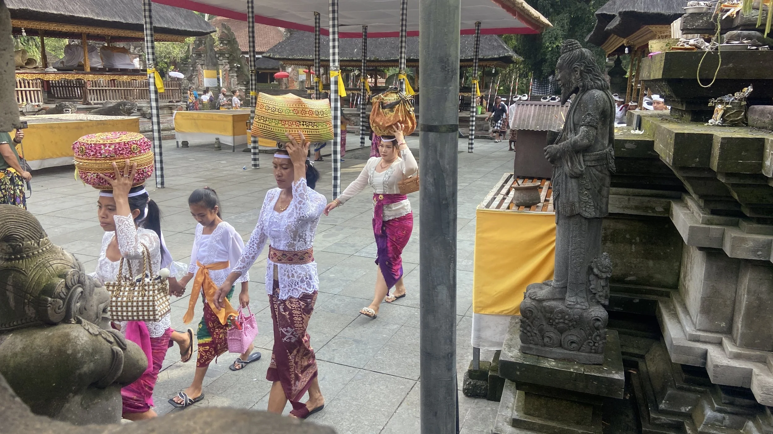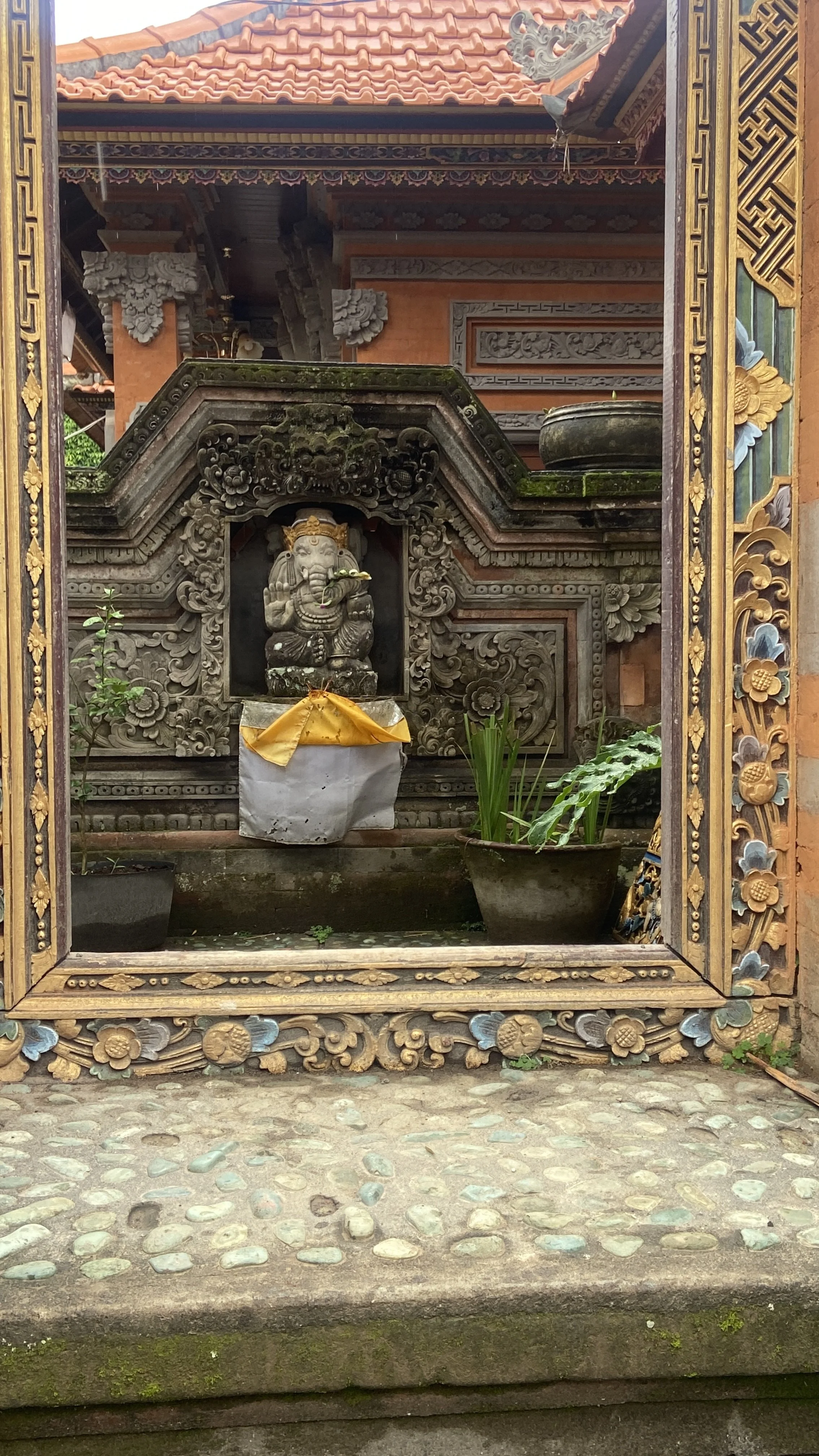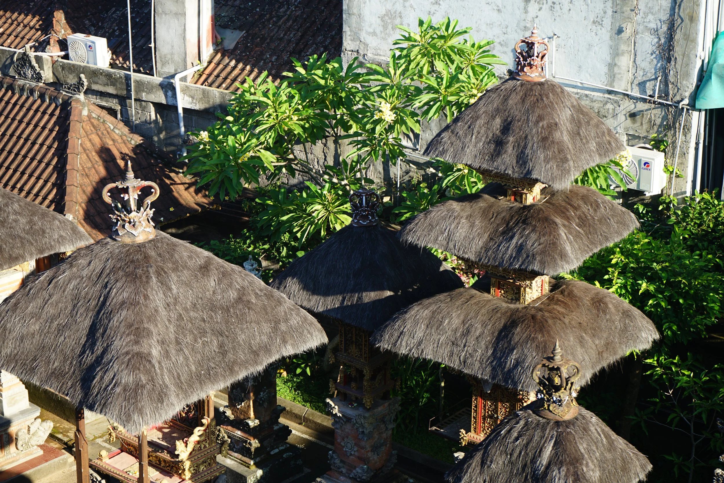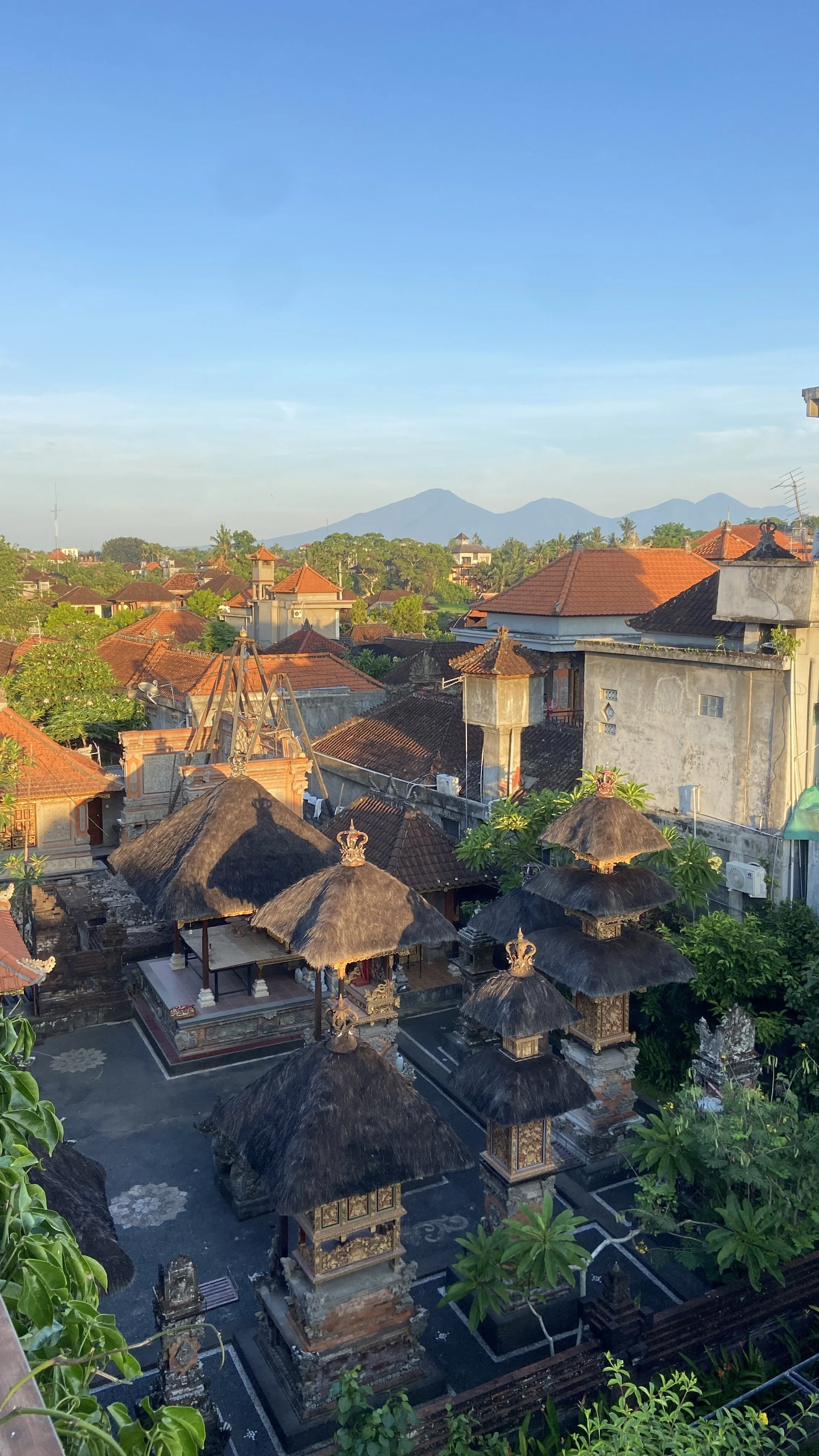 In Ubud haben wir ein Hotel mitten im Zentrum gebucht. Um dieses zu betreten läuft man zunächst durch einen hinduistischen Familientempel. Dort herrscht gerade eine kleine Baustelle, da ein Teil des Tempels zum Bau eines neuen Hausteiles der Familie abgerissen wird. Wir bekommen schönerweise ein Zimmer im höheren Stockwerk und können so einen kleinen Panoramaausblick bewundern.