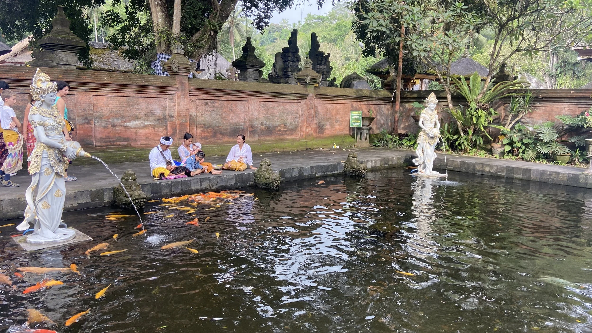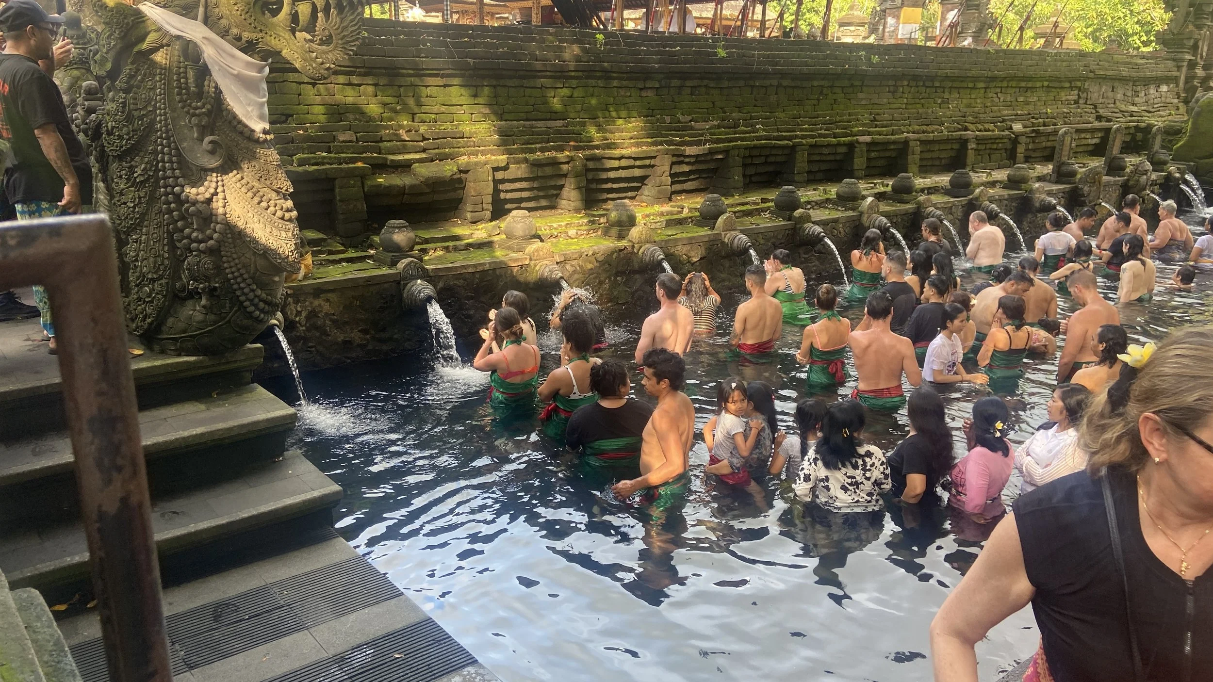 Beeindruckend war auch noch ein Besuch eines Wassertempels. Hier hätte man noch unter mehreren Fontänen ein spirituell reinigendes Bad nehmen können. Das hatten wir bei unserer Hinfahrt eigentlich vor. Dann war es jedoch so voll und touristisch, dass wir davon abgesehen haben. Einen Kracher finde ich auch diverse Verkaufsstände an denen man vorbei geleitet wird, bevor man dann final die Tempelanlage verlassen kann. Glaube und Kommerz in diesem Ausmaß passen für mich irgendwie nicht zusammen, scheinen jedoch wie selbstverständlich hier betrachtet zu werden.